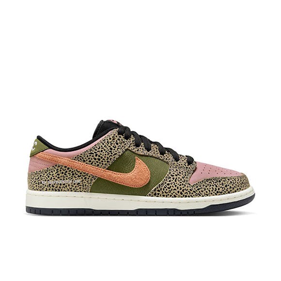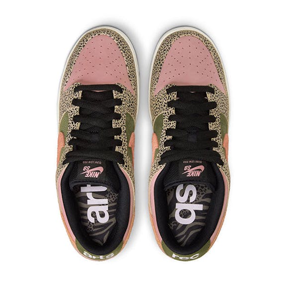 Inspired by the scenery, wildlife and energy of local wildlife institution's 99 acres in Balboa Park, the Nike SB x Arts-Rec Dunk Low Pro reflects the colors of nostalgia through a modern lens with soft hues and animal prints patterning. Rendered in soft, tumbled leather materials in Rust Pink and Rough Green, the Arts-Rec Dunk features a subtle off-black panther print, contrasted by a Sail midsole with a semi-translucent outsole. Completed with hidden homages, custom artwork and animal print sockliners, the Arts-Rec Dunk Low features debossed details and color coordinated laces.